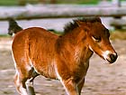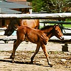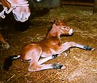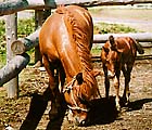 ● 仔馬について。 仔馬は母の体の中で約330日すごしたあと産まれてきます。 産まれた仔馬は1時間もすると立ち上がり、母の乳をさがしながら歩きまわり、やがて乳を飲みはじめます。 仔馬は母馬といっしょに行動しますが、やんちゃな仔馬のばあい、母馬は手をやき、遠くの方へ遊びにいっても見えていてればあまり気にはしません。 しかし、いくら手をやいている仔馬でも、他の馬から”ちょっかい”をかけられたり、自分の視界から消えて、しばらくすると鳴いて仔馬を呼びます。 | ![]() |