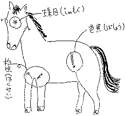 馬を個体識別するには毛色の他に、生まれた時からある特徴と、生まれてからできて、一生消えない特徴で識別します。 |