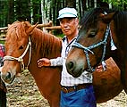 平成8年4月27日より 体験乗馬ができるようになりました。 コース1周(160m)500円の引き馬です。 夏休みには大変なにぎわいをみせ、8月の乗馬人数は2,860人。 4月から11月末までに7,214人の方に乗っていただきました。 ありがとうございました。 小さい子供さん(1才)から年配の方(90才)まで多くの方に楽しんでいただけたようです。 活躍してくれた5頭の馬たちは、この「20馬力」の中で紹介していこうと思っています。 今年度の営業は11月末にて終了しました。 今年は4月から営業の予定です。 是非乗馬を体験してみて下さい。お待ちしています。 |